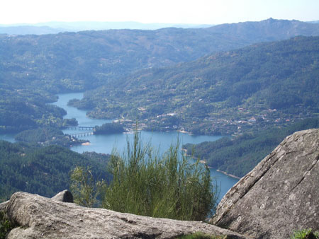 Vista do Miradouro de Pedra Bela – foi aqui em cima, a mais de 800 metros de altitude, que soubemos que o nosso sobrinho-neto, Martim, já nascera! Lá ao fundo, o Cávado e a albufeira da barragem da Caniçada. Na encosta, í  direita, escondida pelo penedo, a Vila do Gerês.