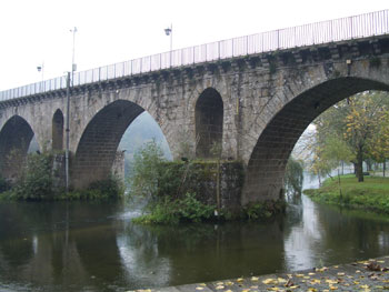 A primeira paragem foi em Arcos de Valdevez. Foi uma paragem rápida, que a chuva era muita, mas deu para ver alguns edifício feiosos, mas uma imagem bonita para compensar: a ribeira de Vez, passando sob a ponte do século XIX, árvores seculares em ambas as margens e, reflectida nas águas, a torre da igreja de S. Paio.